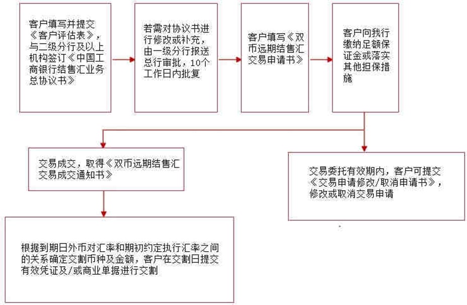叙做具体交易前,客户需要提交双币远期结售汇交易申请书,并对交易申请书所附的风险揭示内容及银监会规定事项进行书面确认,确认已充分理解交易结构与潜在风险,愿意承担相应交易风险和潜在损失。交易达成前客户还需根据工商银行要求提供必要担保措施。交易达成后双方在产品存续期间及到期日按照协议履行相关交割或支付义务。