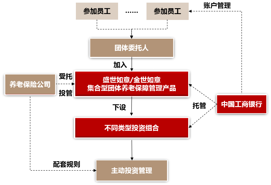 (1)产品概述及产品特色 产品概述: 为了更好地满足企事业单位的员工养老、薪酬福利管理需求,中国工商银行发挥深耕养老金市场多年积累的服务经验和专业优势,优选养老保险公司合作推出团体养老保障管理产品。团体养老保障管理产品可以满足不同类型团体委托人及其成员的养老保障、薪酬延付、员工持股、人才激励等需求,帮助其实现员工短、中、长期相结合的立体式激励。 产品特色: 依法合规、资金安全 银保监会备案产品,依法合规;采用信托管理模式运作,充分保障基金的独立性和委托人、受益人权益,资金独立安全。 账户清晰、权属明确 产品采用账户式管理模式,可设置独立的委托人账户、员工个人账户等,可满足委托人个性化规则设置需求,包括人员离职、退休、变动等的后续处理规则等。 投资稳健、保值增值 凭借专业的投资管理实力和丰富的优质资产储备,为委托人计划资金的保值增值提供安全有效的投资管理方案,并配套各类不同风格的投资组合,保障受托资产的稳健增值。 服务周到、查询便捷 依托优质的运营服务体系,发达的服务网络,强大的科技研发实力,为委托人及其员工提供多渠道的账户查询服务。 (2)产品介绍 盛世如意集合型团体养老保障管理产品由中国工商银行和长江养老保险股份有限公司联合推出,金世如意集合型团体养老保障管理产品由中国工商银行和太平养老保险股份有限公司联合推出,中国工商银行承担产品账户管理和资金托管职责,养老保险公司承担产品受托和投资管理职责。产品下设不同类型的投资组合,可以满足客户养老保障、薪酬延付、员工持股、人才激励等多样化的养老及薪酬福利管理需求,业务架构图如下。